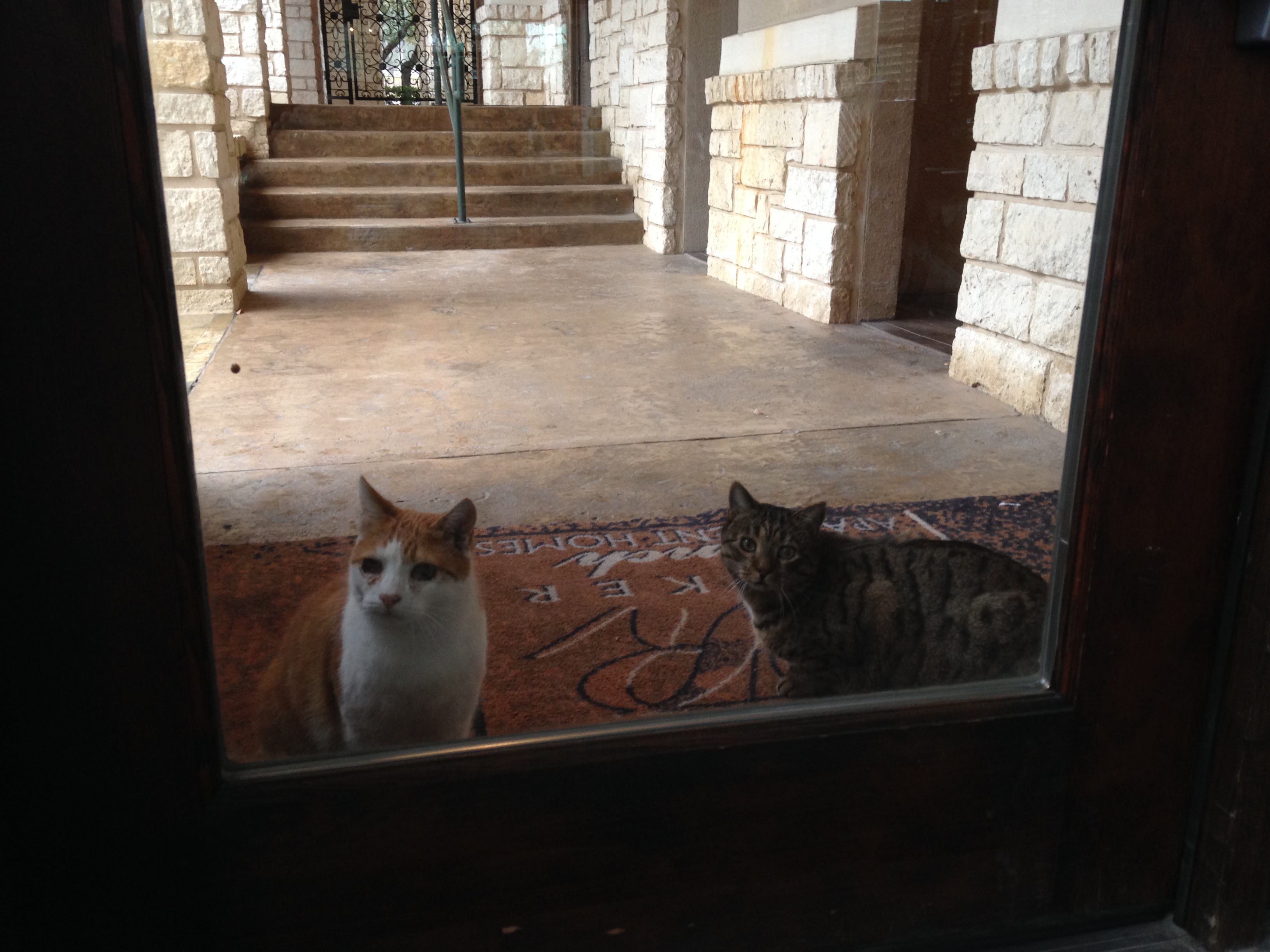 Und da bleiben sie dann auch, die Nasen an der Glastür platt gedrückt, als sei ich grad in einem Steakhaus oder Fischladen oder sonstigen Katzenparadies verschwunden. Abartig! Die beiden drücken sich denn auch über eine Stunde vor dem Fitnesszenter rum, abwechselnd kann ich sie auf Bäumen rumklettern, durch Büsche huschen oder einfach auf dem Fenstersims sitzen sehen. Und prompt: Kaum öffne ich die Tür und trete aus dem Fitnessraum, spicken die beiden aus zwei Büschen und begleiten mich quasi „bei Fuss“ zurück zur Wohnung. Eine Dame mit Winz-Hündchen, die uns entgegenkommt, schüttelt nur ungläubig den Kopf. Ein Mitarbeiter des Wohnkomplexes hingegen, der mich schon des Öfteren so gesehen hat, marschiert unbeeindruckt an uns vorbei. Nichts neues für ihn 🙂