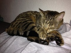 Zu meinem grossen Erstaunen bekundet Merlin weder Probleme beim Besteigen von Möbeln noch beim Erklettern des Katzenklos. Er besteht auch darauf, dass er bei mir auf dem Bett liegen kann wie sonst immer. Auf dem extra hergerichteten Nestchen am Boden ist er rastlos und ganz offensichtlich unzufrieden. Einmal neben mir, fällt er aber sofort in einen tiefen Schlaf, die Narkose fordert ihren Zoll. Auch die Schmerzmittel machen ihn recht groggy und wenn er wach ist, tappst er einigermassen belämmert umher.