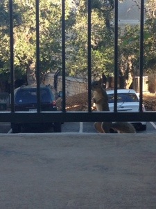 The cute animal thus hangs on the wall and rants to itself. Before long, it hops onto the projection that runs from the patio along the wall right underneath our windows, looks at us and scolds us for all it’s worth. Then it turns around towards Oscar who is still cozily sitting on the patio. He isn’t intimidated by all the turmoil but his astonishment about such a naughty animal that looks like a squirrel but acts like a fury is apparent. I see the same expression on Merlin’s little face and – as I learn from Greg – the same expression is also reflected on my face… still I can hardly believe that this giant squirrel – for the ones in Europe are way smaller – flits vertically up and down the walls. While loudly proclaims its displeasure. But only throws out a brief glimpse, nods and confirms that this has happened to him many times before: A squirrel coming down the wall and barking at him. Normal, they do this. And he lies back down. The tranquil soul of an experienced man. It takes more to astonish him. A hike right through a cow pasture, for example 🙂