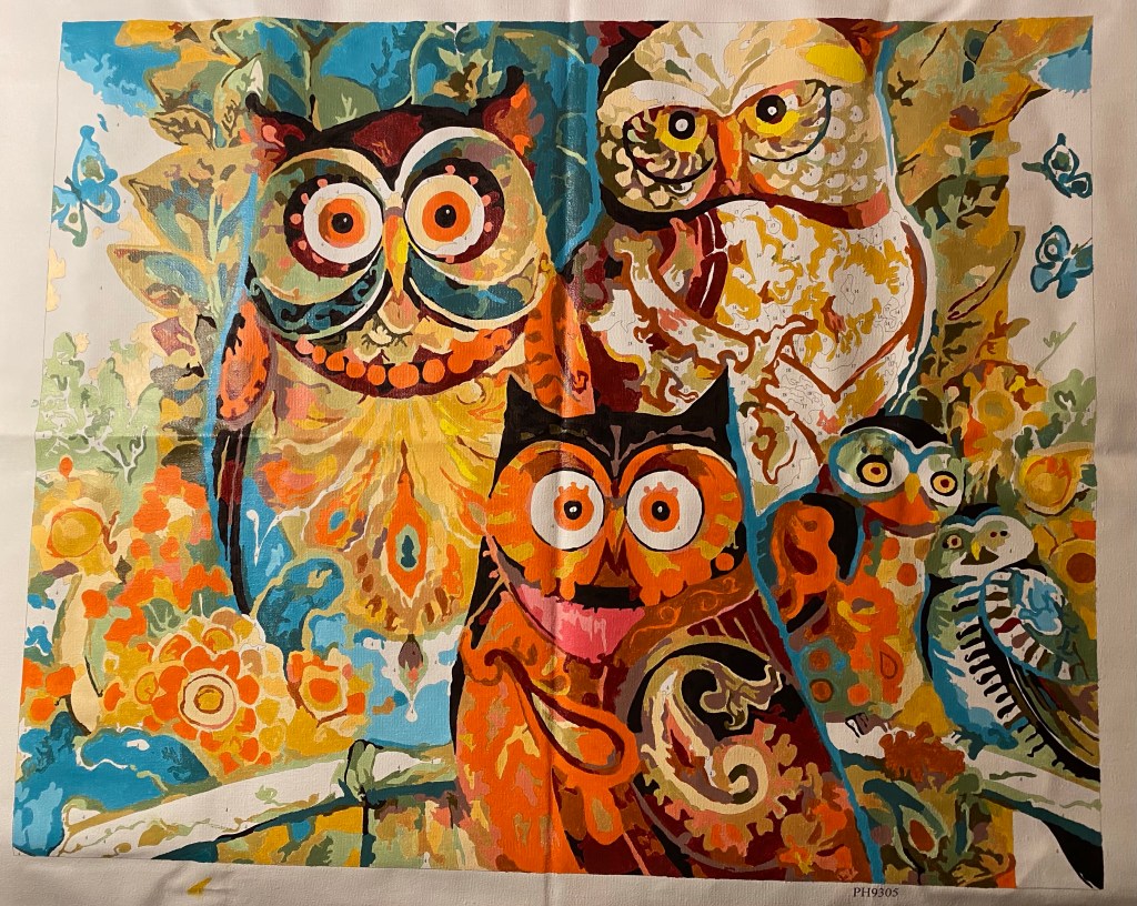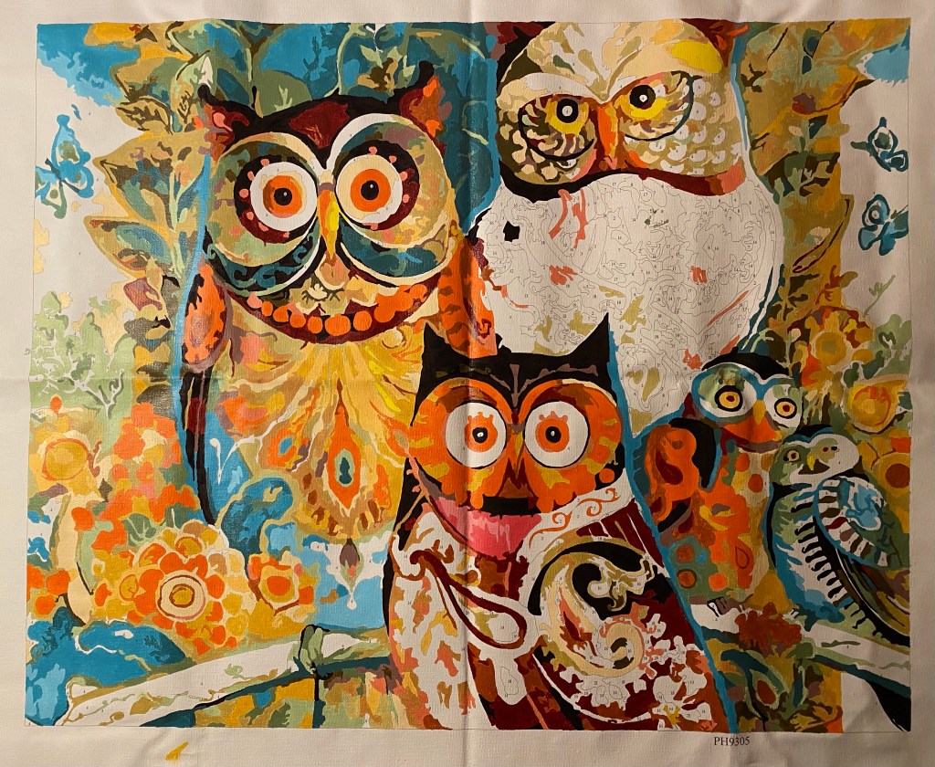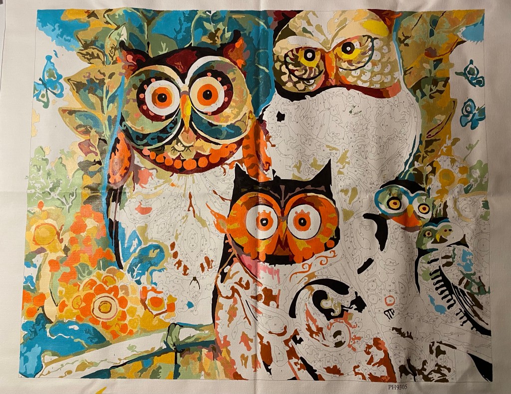 So after finishing one in fall for my neighbor’s birthday I decided to start another “painting by numbers” painting, this time for my better half who just as I happens to love owls.