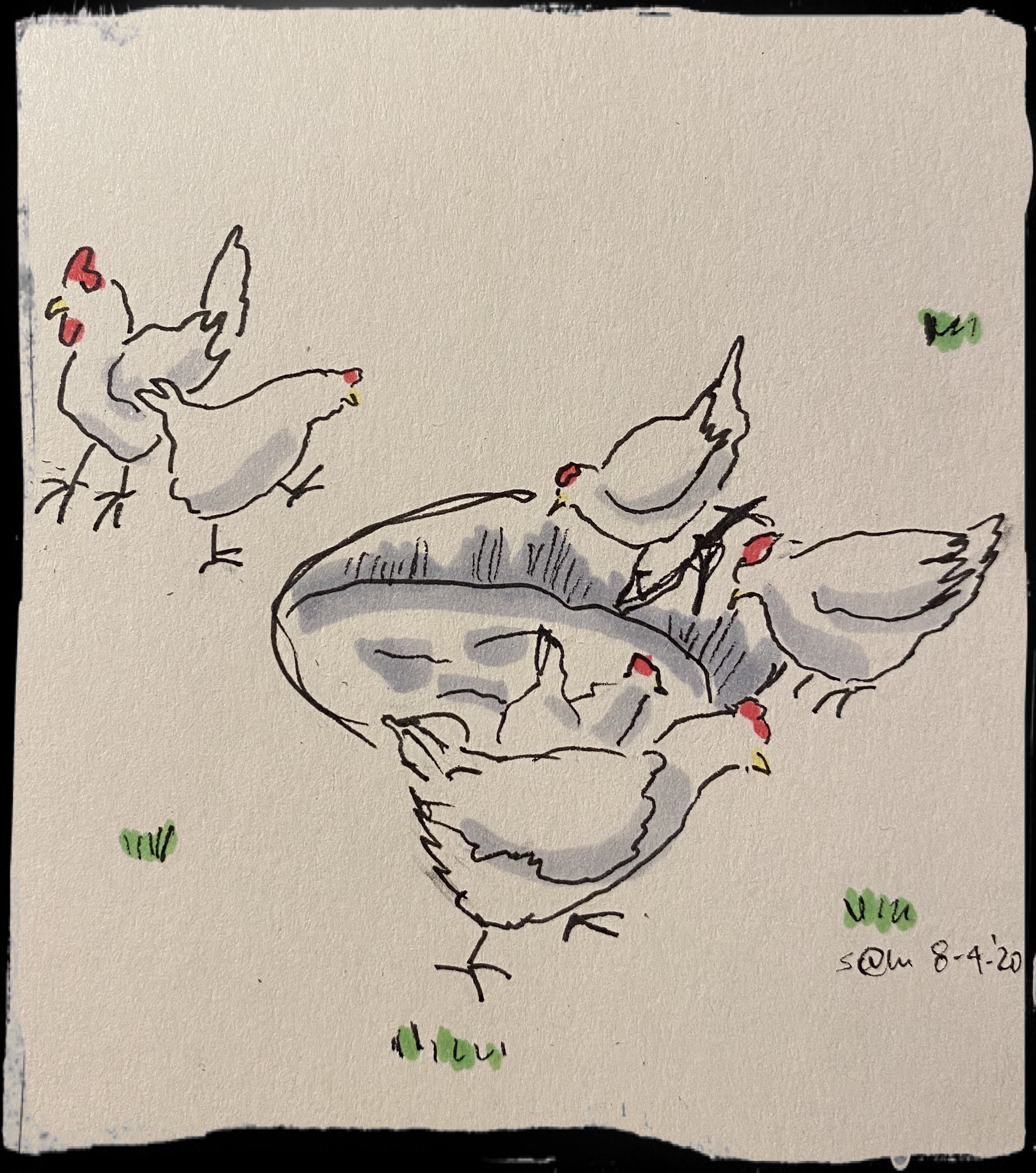 For about a month now they have been in a field with low bushes in a tree nursery and when it last rained a puddle formed in one of the empty holes where a l bush had been dug out and the chickens used it as a bath. So precious, the sight was simply too sweet!