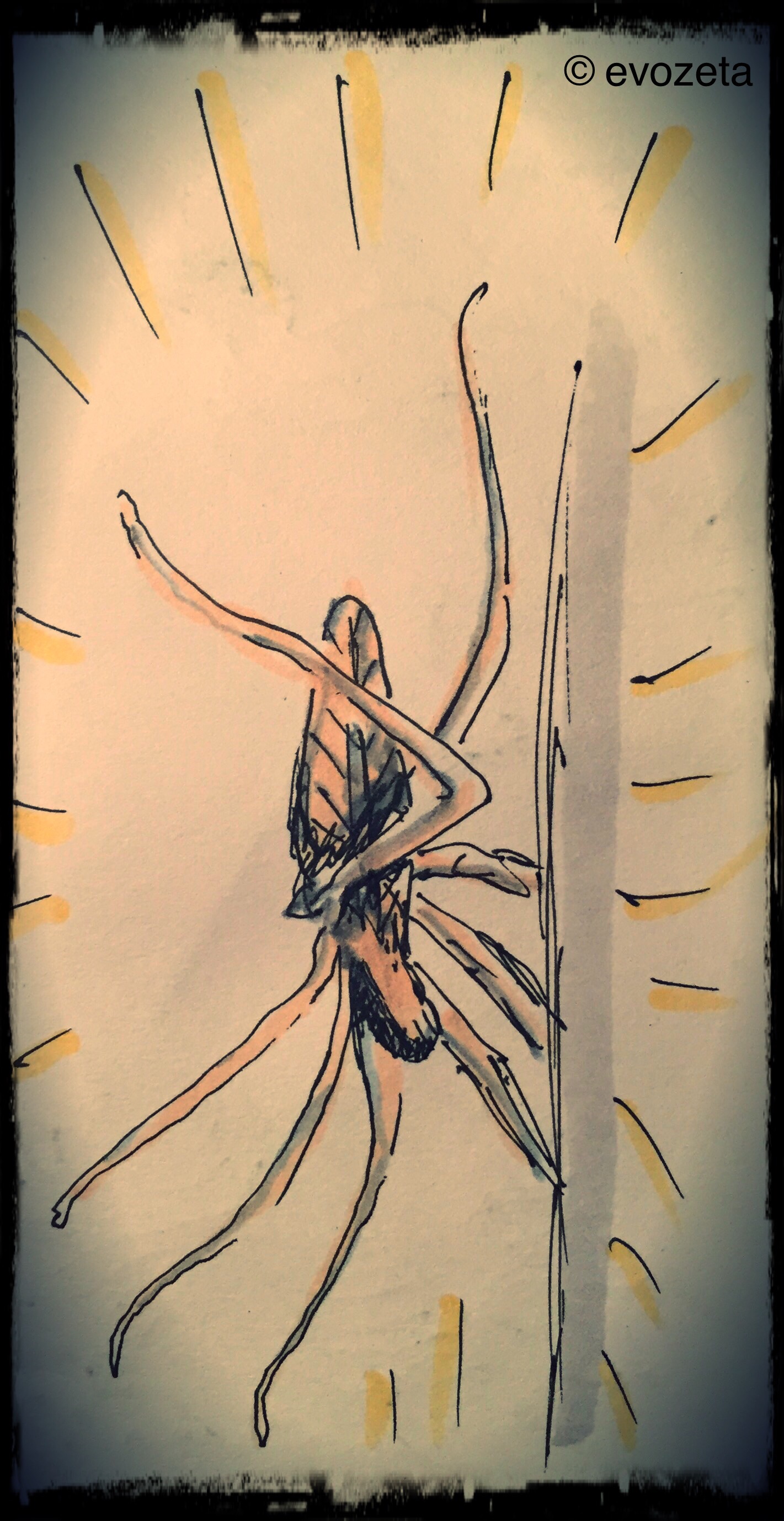Last night then, my mum told me how in the morning before leaving the apartment she quickly threw on her jacket… only to find a handfull of straw or something in her sleeve. She held the little straw puff between her fingers but when that didn’t really work she released the grip – only to witness how the straw puff unfolded lightening quick and disappeared on eight swift legs… exactly, it was the monstrous house-spider that made itself a cozy nest in mamma’s jacket sleeve. Gestern dann erzählte mir meine Ma, wie sie sich morgens vor dem Verlassen der Wohnung rasch ihre Jacke überstreifte… nur um eine Handvoll Stroh oder etwas dergleichen in ihrem Ärmel vorzufinden. Sie hielt das kleine Strohbüschel zwischen ihren Fingern um einen besseren Blick darauf werfen zu können und als dies nicht wirklich gelang, öffnete sie die Finger – nur um mitzuverfolgen, wie sich das Strohbüschel blitzschnell entfaltete und auf acht flinken Beinen im Schlafzimmer verschwand… genau, es war unsere Monster-Hausspinne, die es sich in Mamma’s Jackenärmel gemütlich gemacht hatte.