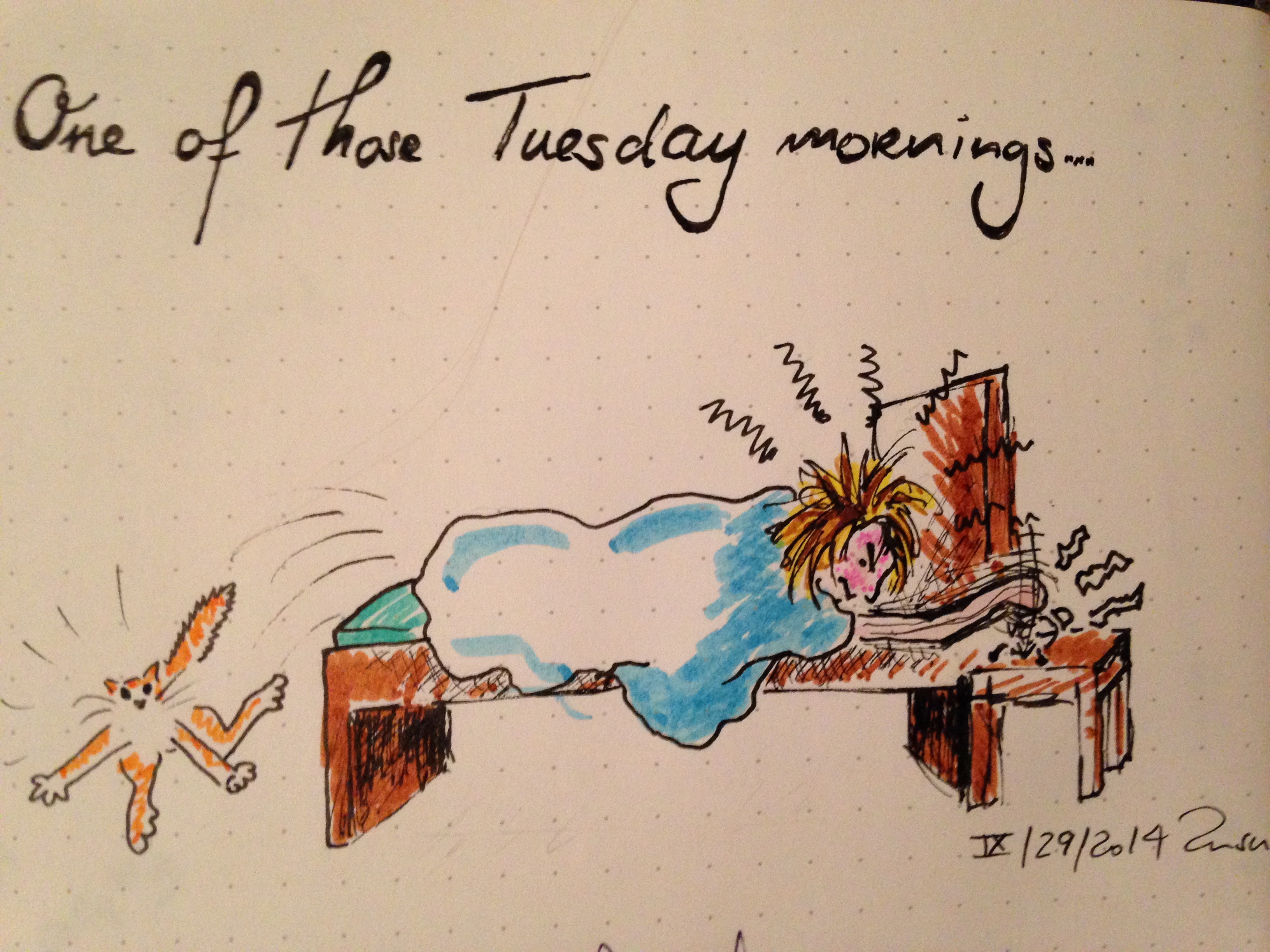 This week I’ve had a rather artsy streak. I finished three drawings plus I captured my Tuesday morning mood in a quick doodle. For some reason the alarm clock drove me mad. Not sure what the story is there. Ah well, sometimes we simply find ourselves in strange moods. As long as we can shake them off rather easily all is good. (Für Deutsch hier klicken)