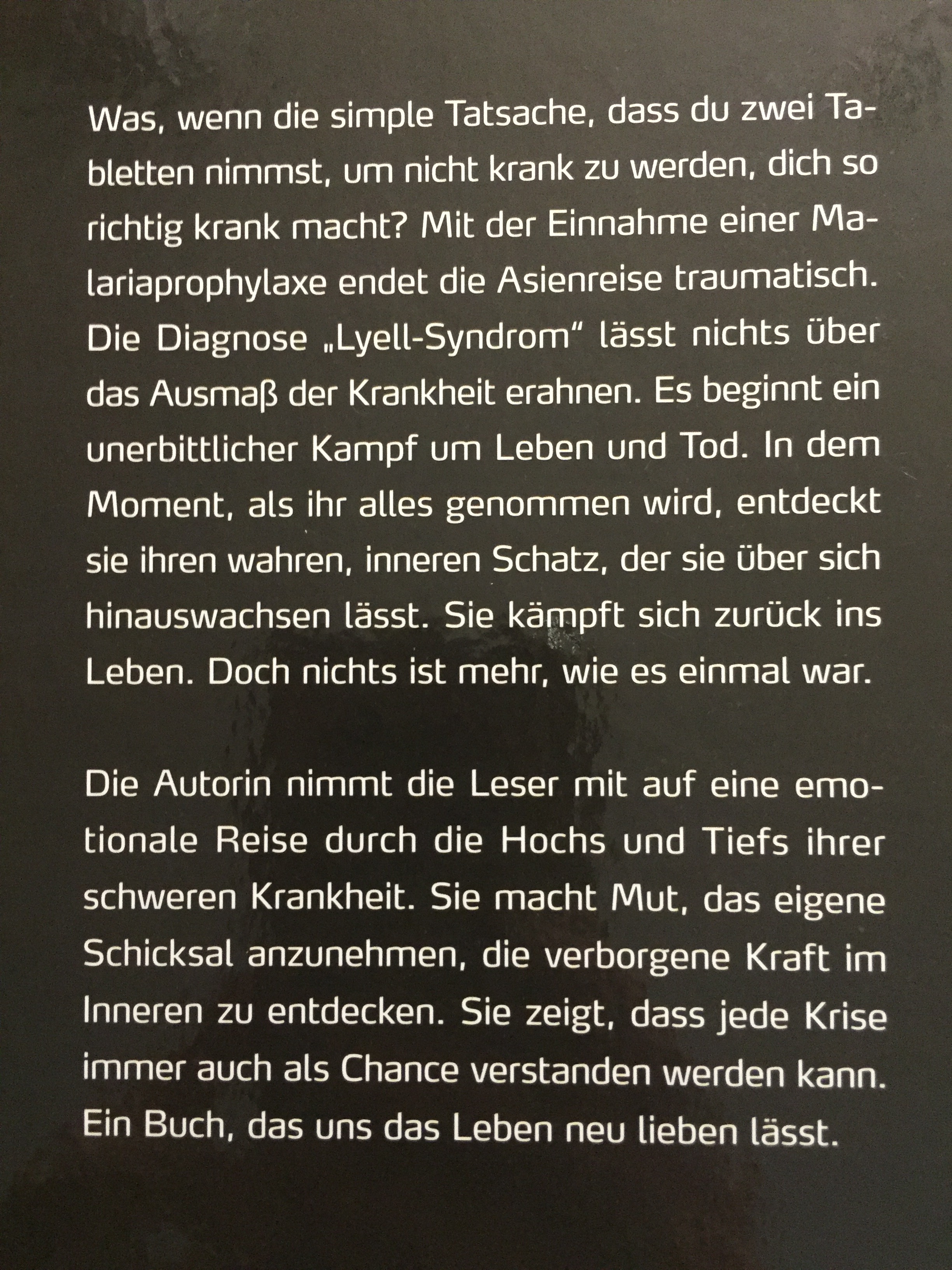 Blurb on back of book: What if the simple act of taking two tablets to prevent you from a disease turns into the thing that actually makes you sick? After taking a malaria prophylaxis the holiday in Asia ends traumatic. The diagnosis “Lyell-Syndrome” doesn’t presage the extent of the disease. A relentless fight to the death ensues. The very moment everything is taken from her she discovers her true inner treasure which helps her to surpass her own abilities. She fights her way back to life. But nothing will ever be the same. The author takes the reader for an emotional ride through the highs and lows of her serious illness. She’s bolstering us up to take on our own fate, to discover our inner strength. She shows us that every crisis always encompasses a chance. This book makes us love life anew.