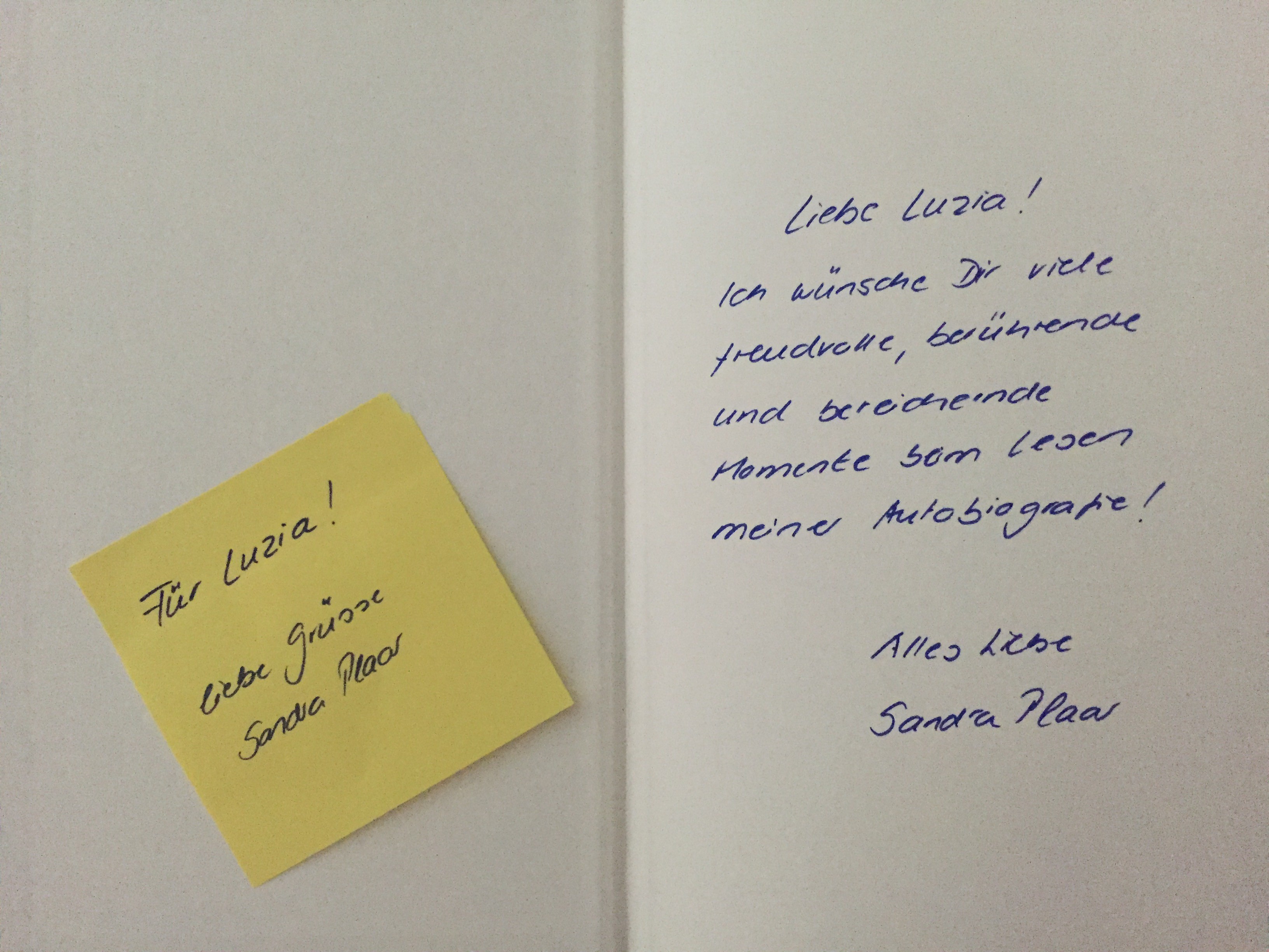 Post-it note: For Luzia! Best wishes, Sandra Plaar == Inside Book Board: Dear Luzia! I wish you many joyful, touching and enriching moments while reading my autobiography! All the best! Sandra Plaar