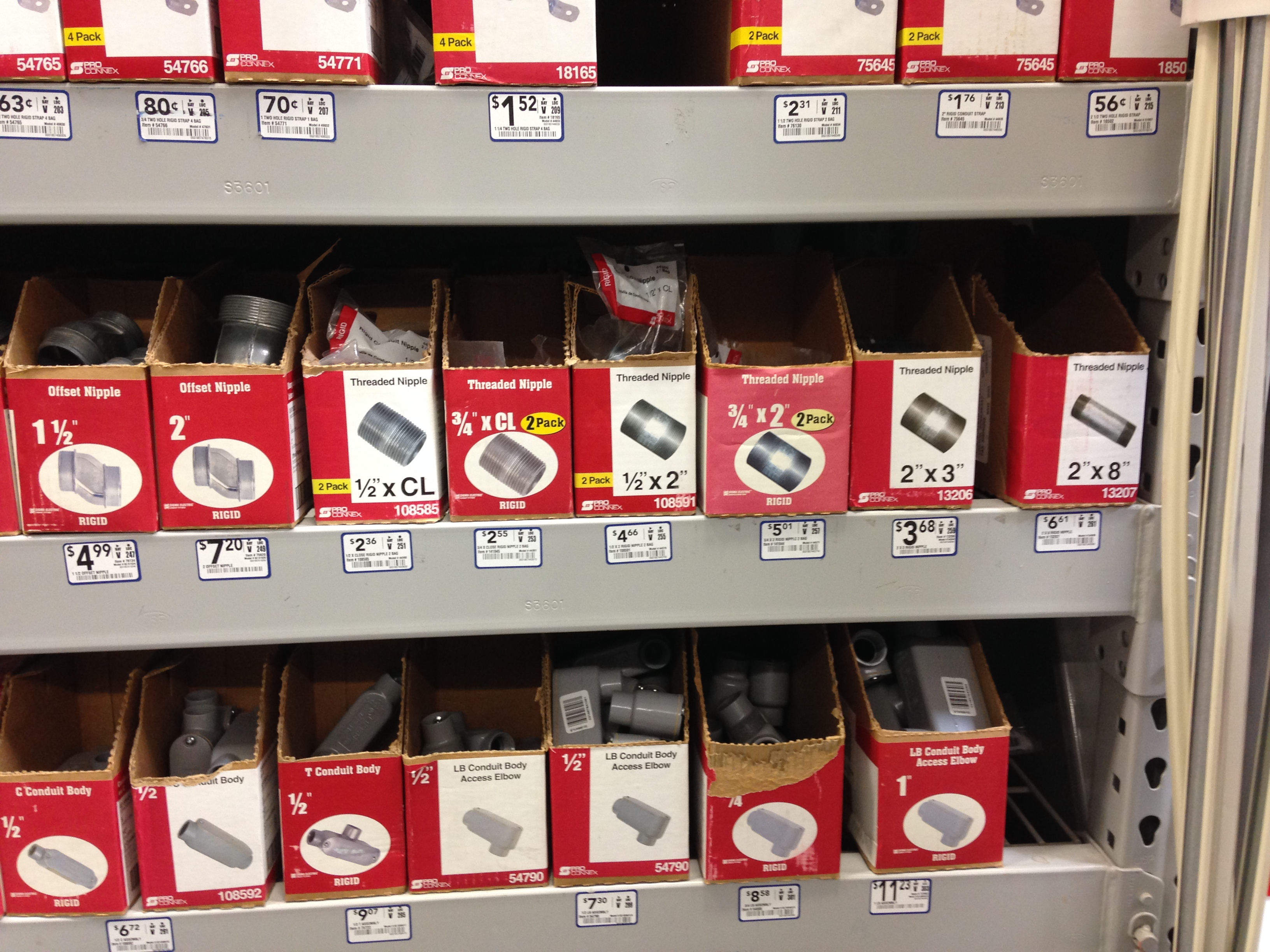 In any case, we recently had to pay a visit to the orange giant for the purpose of installing the cat door into the (human) apartment door. It wasn’t long until the usual thing that happens to me there – and for that matter basically inmost American stores – on a regular basis: Owing to the gigantic assortment I got a little fatuous, which then leads to silly and therefore droll. That’s probably because there are simply too many shiny objects with switches and knobs. Or with funny names. Thus a pipe socket with thread, or also “Threaded Nipple”, made me break out into uncontrolled giggles, which then of course dragged on through the whole store. That again gets Mr. R. a little embarrassed, but it has the advantage of efficiently increasing his decisiveness which gets us out of the store way quicker.